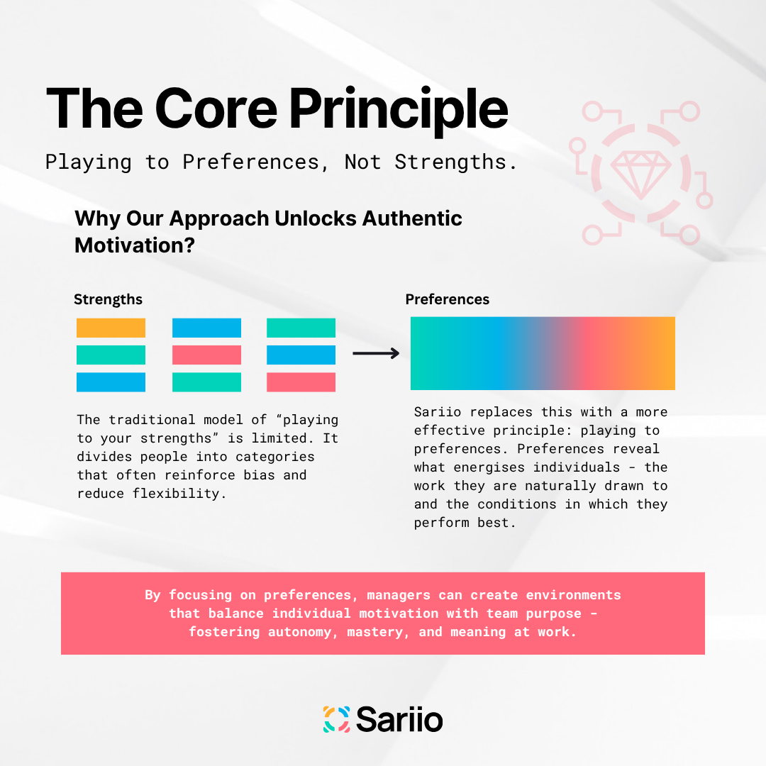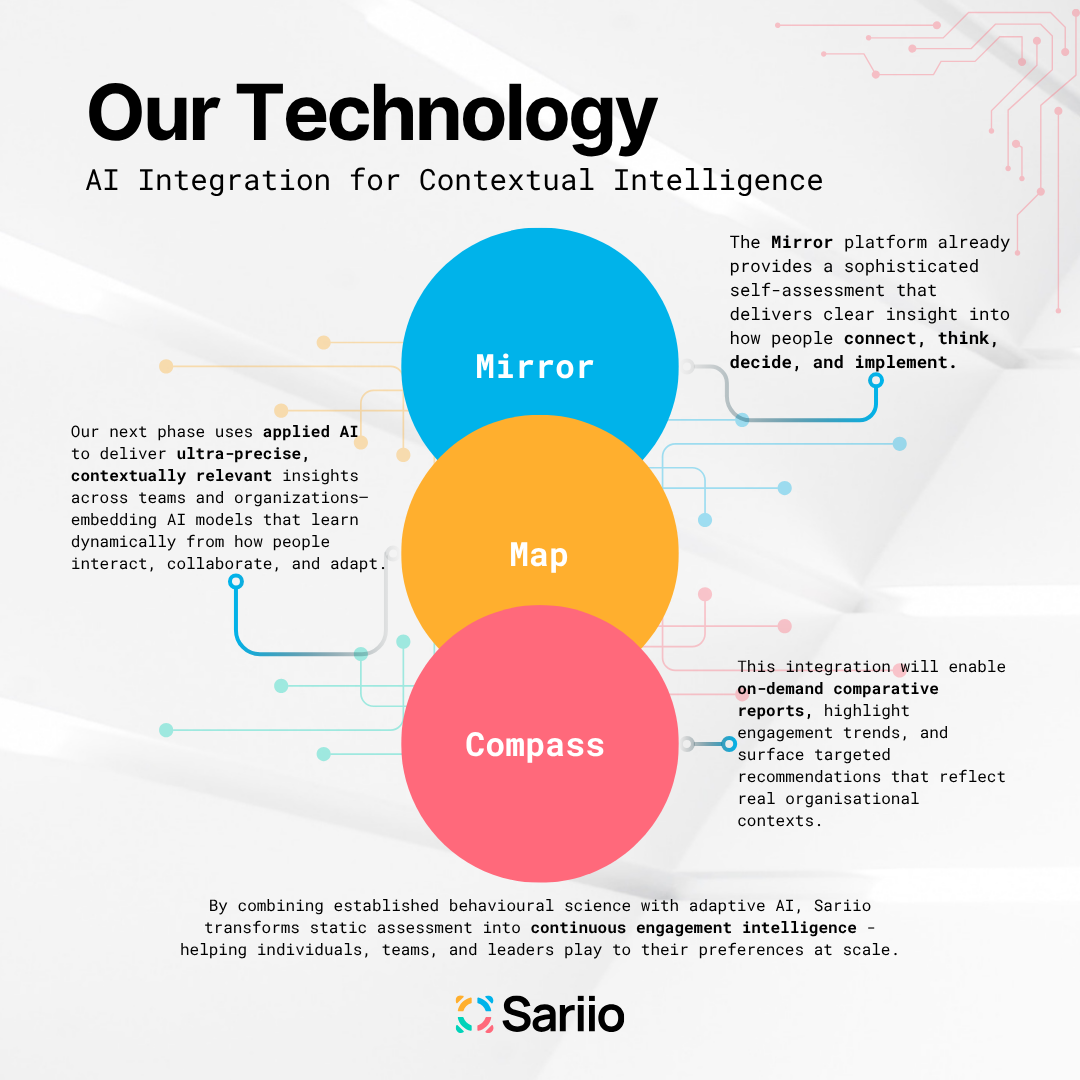 By combining established behavioural science with adaptive AI, Sariio transforms static assessment into continuous engagement intelligence – helping individuals, teams, and leaders play to their preferences at scale.