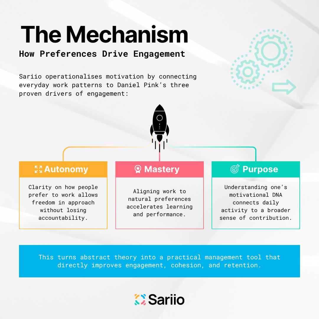 Sariio operationalises motivation by connecting everyday work patterns to Daniel Pink’s three proven drivers of engagement: