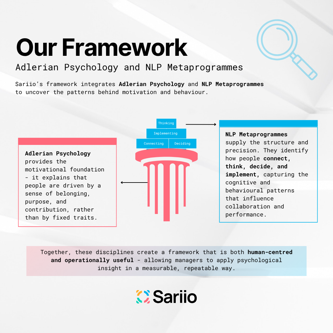 Sariio’s framework integrates Adlerian Psychology and NLP Metaprogrammes to uncover the patterns behind motivation and behaviour.